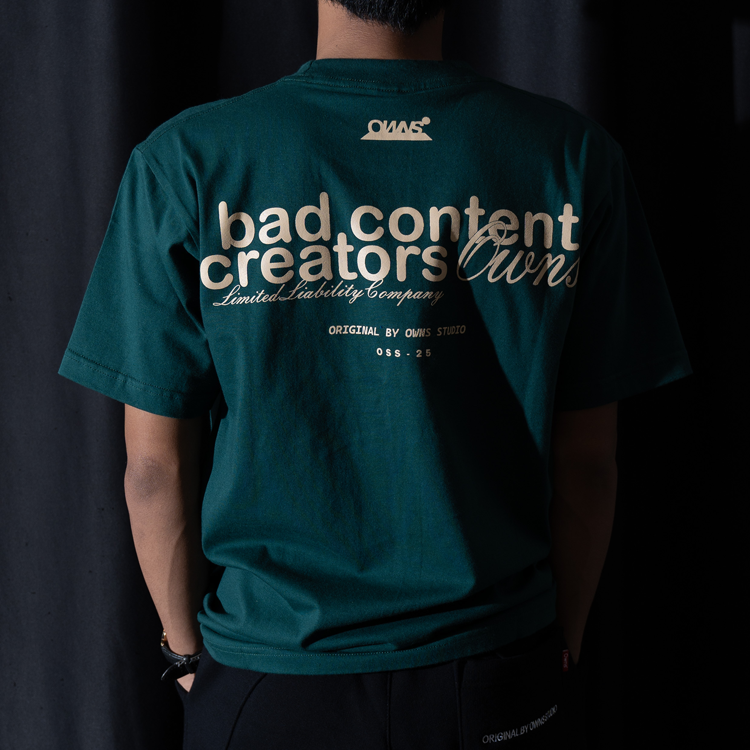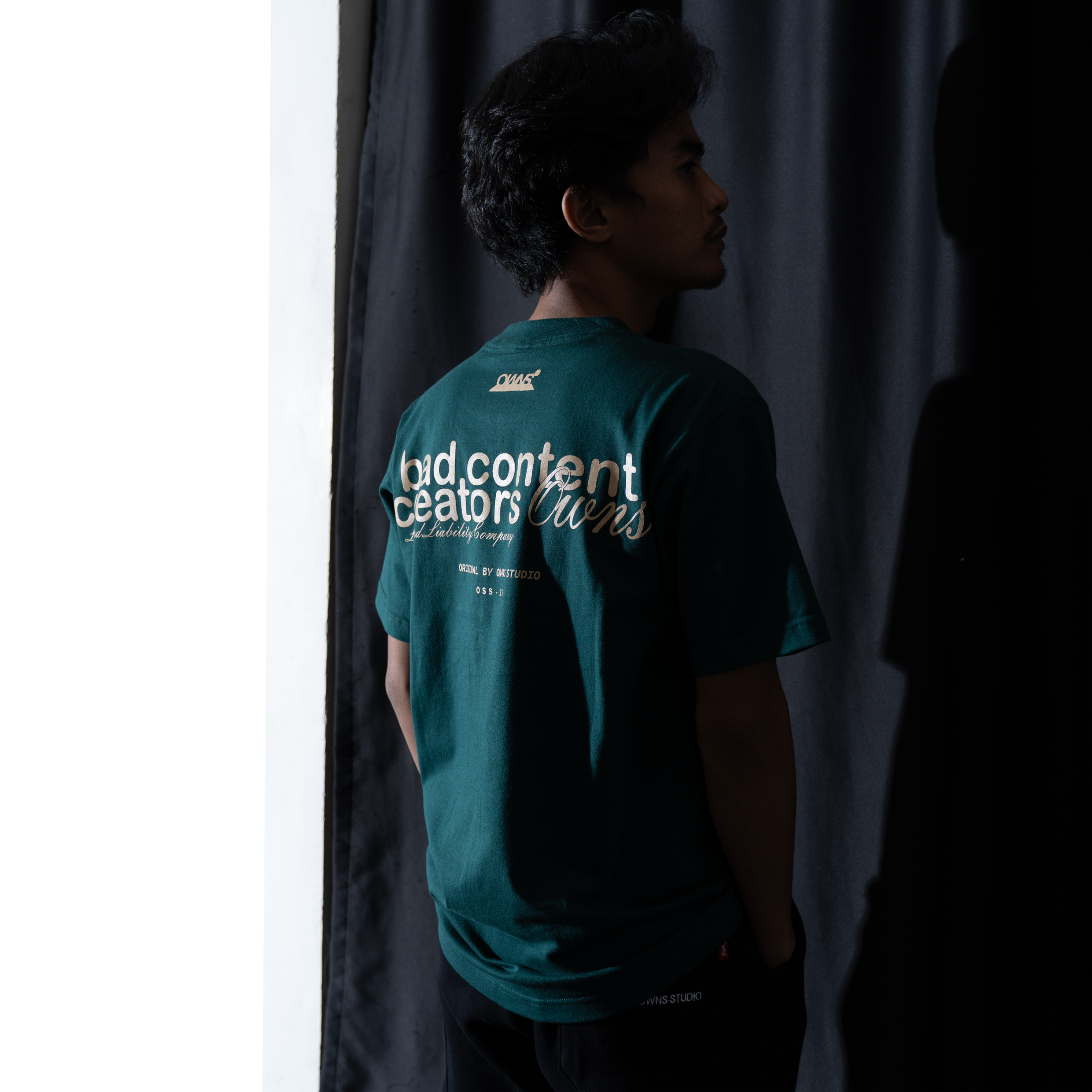 Tees “Pagbati” dari OWNS Studio hadir dengan warna Forest Green yang elegan dan berkarakter. Mengusung slogan khas “bad content creators owns”, desain ini merepresentasikan semangat kreatif, autentik, dan percaya diri.