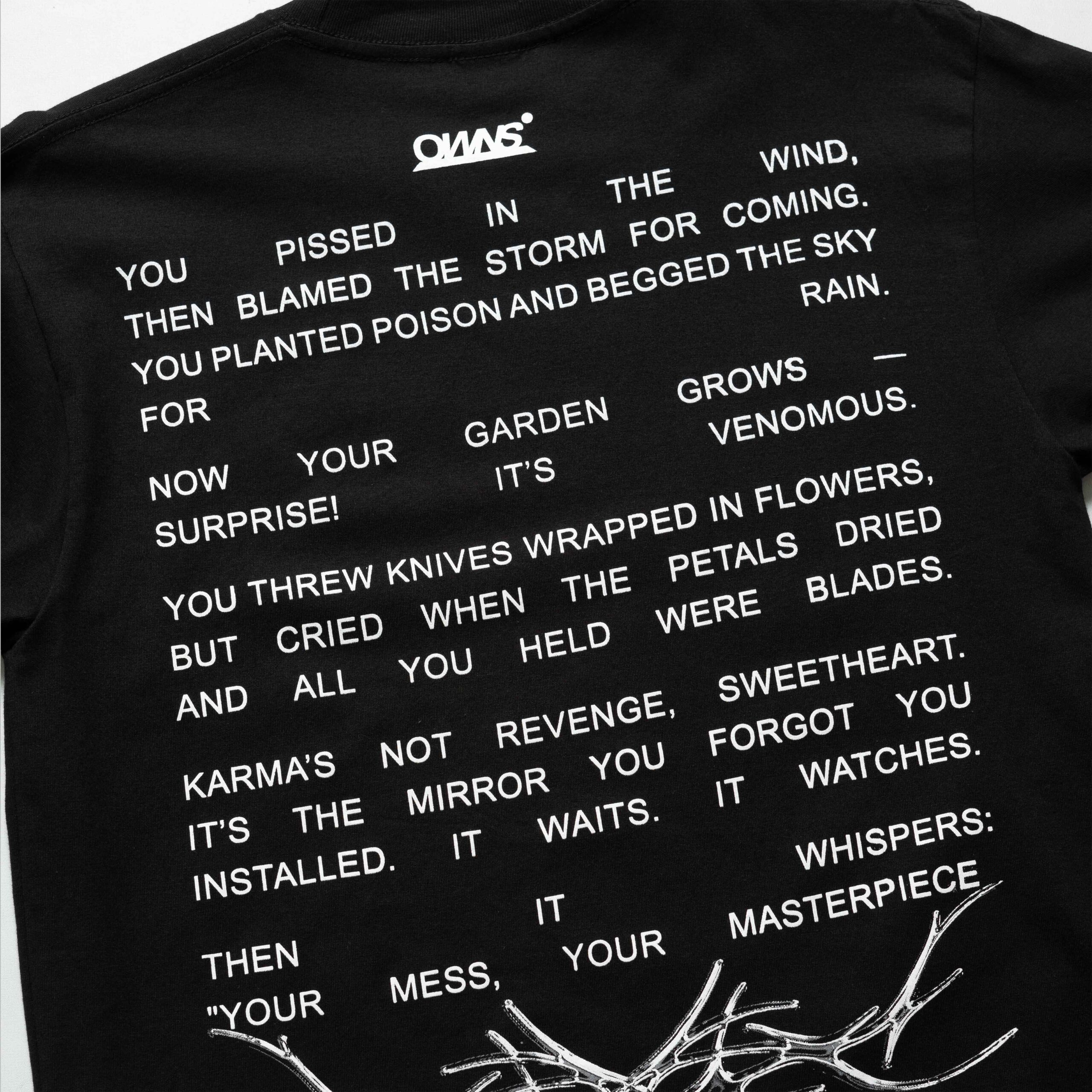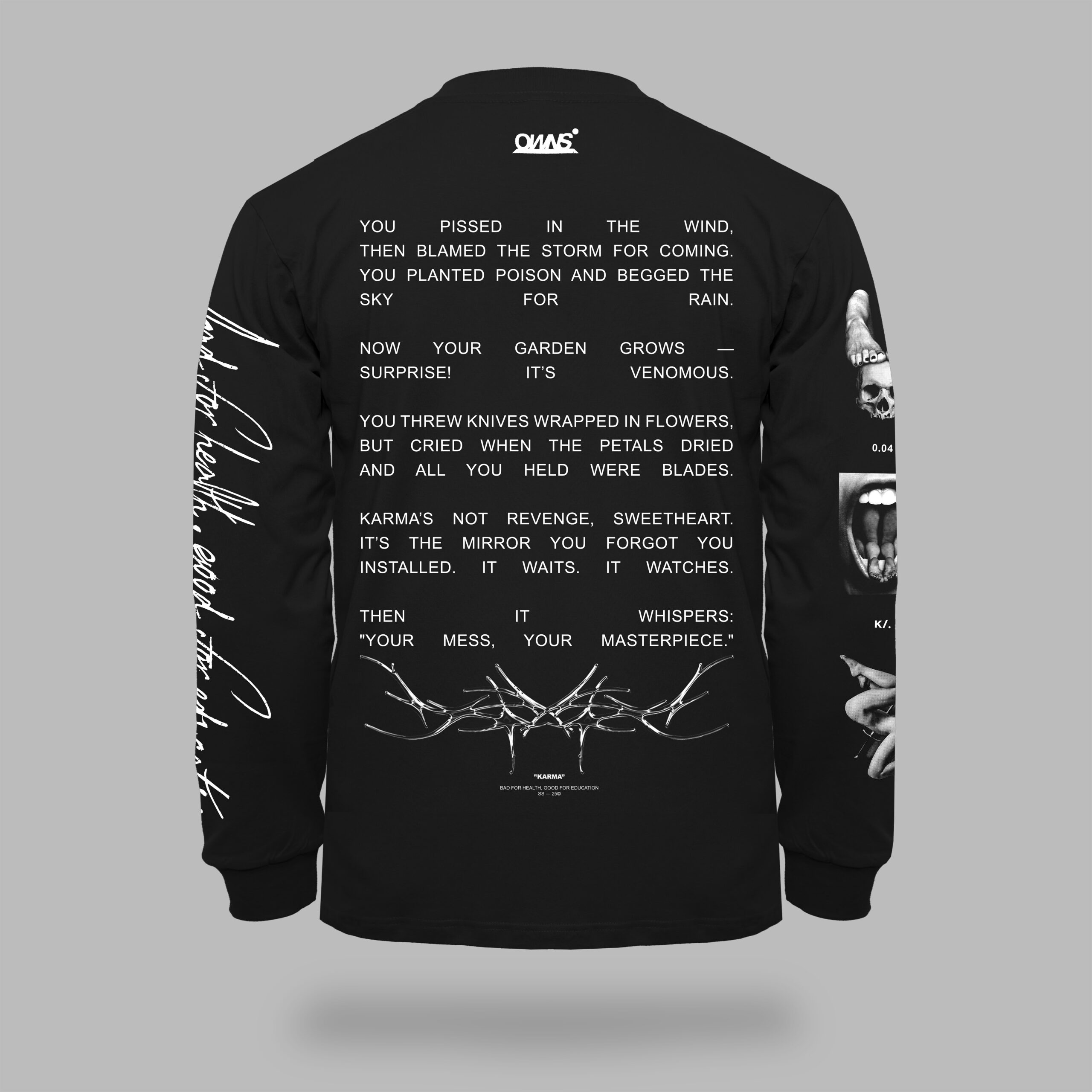 Longsleeve “Karmalo” hadir dengan desain bold yang penuh makna, menampilkan grafis wajah artistik pada bagian depan, detail visual edgy di kedua lengan, serta quote penuh pesan kuat di bagian belakang. Menggunakan bahan cotton 20s yang lembut dan adem, kaos ini memberikan kenyamanan sekaligus tampilan streetwear yang berani. Koleksi ini cocok untuk kamu yang ingin tampil beda dengan sentuhan dark-art dan statement style khas Owns®