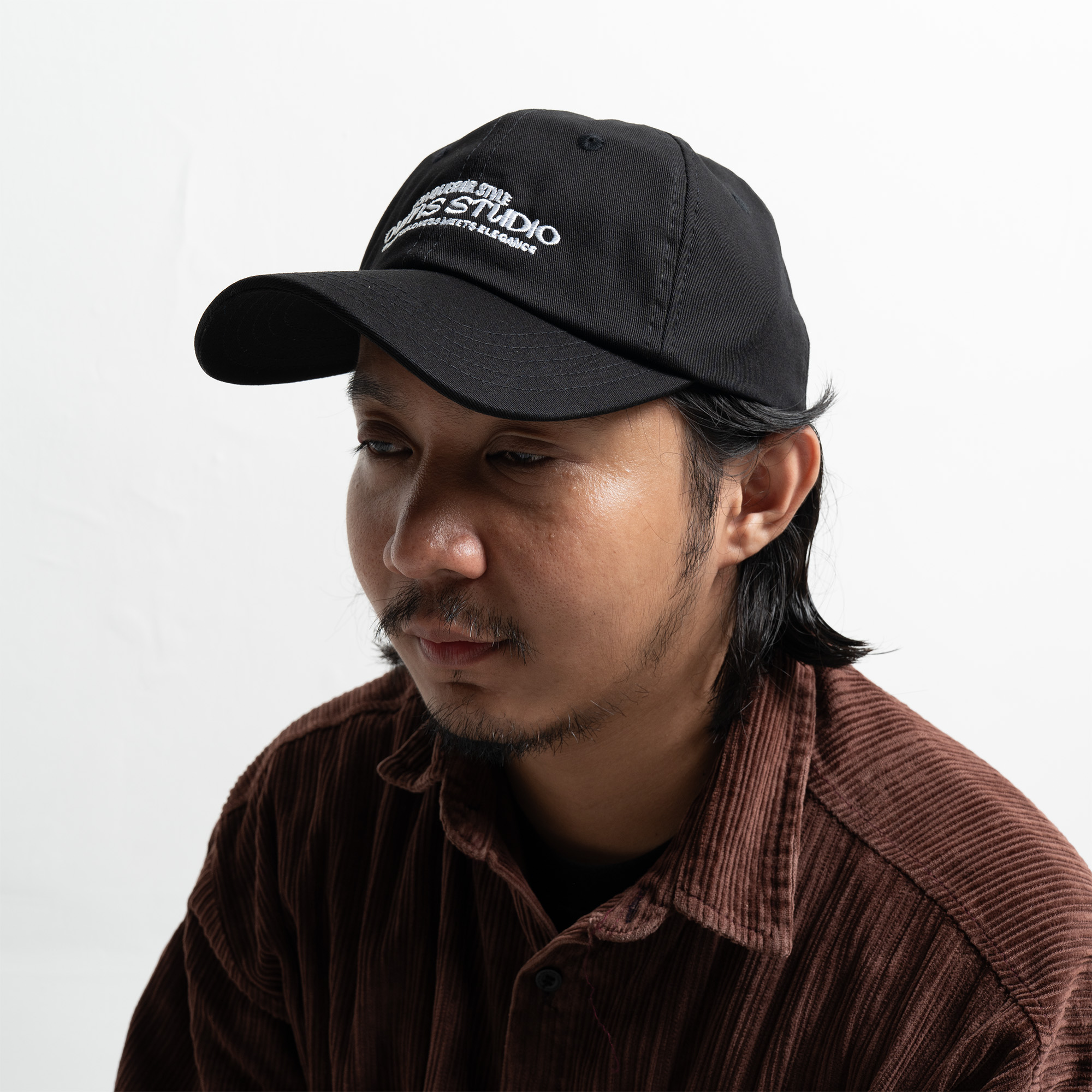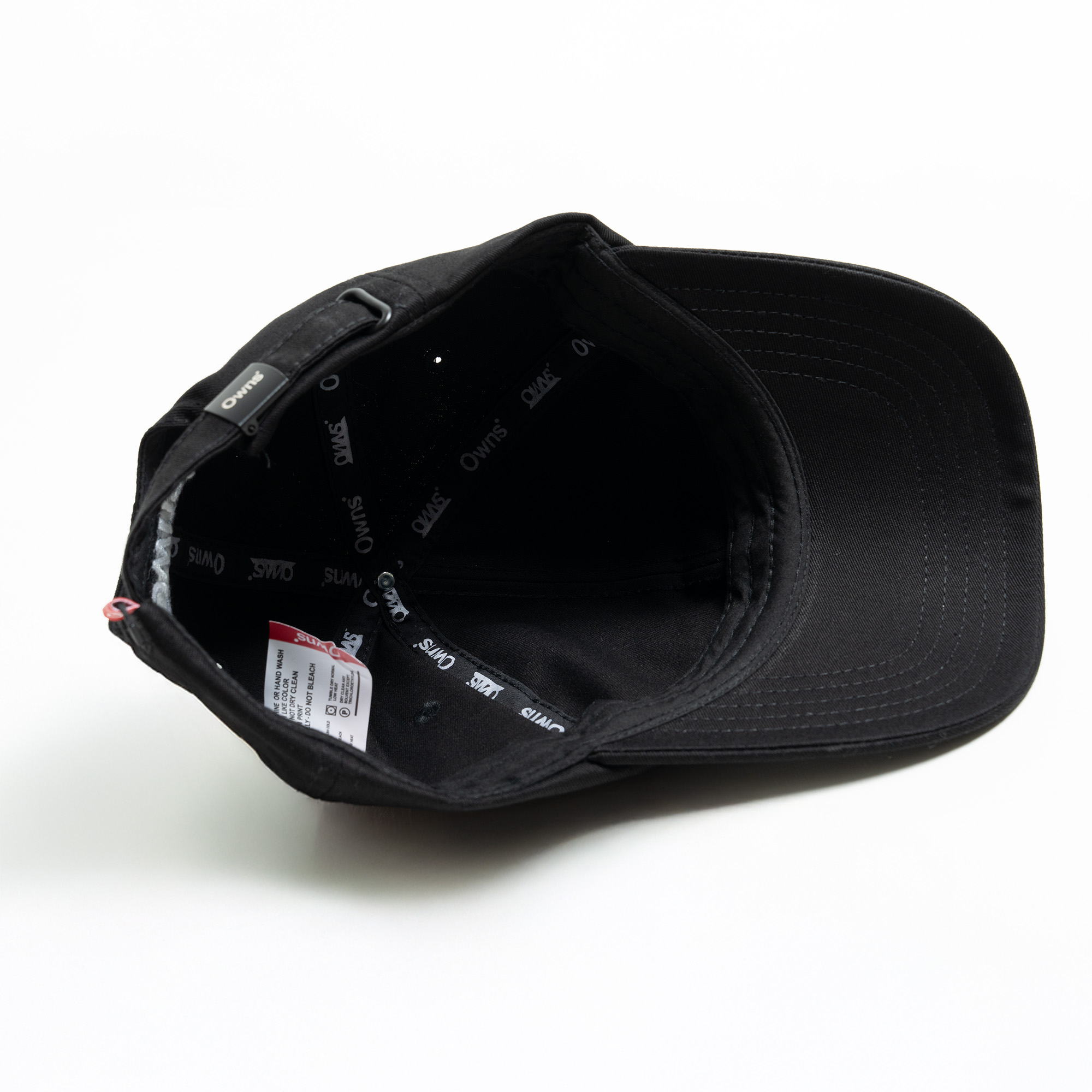 Bagian depan menampilkan bordir bertuliskan “Conqueror Style – Owns Studio / Where Boldness Meets Elegance” sebagai statement utama yang merepresentasikan karakter Owns Studio. Detail bordir logo Owns pada sisi belakang memperkuat identitas brand, dilengkapi strap adjustable dengan label merah khas Owns sebagai sentuhan visual yang ikonik. Eyelet ventilasi disematkan untuk menjaga sirkulasi udara dan kenyamanan saat digunakan.