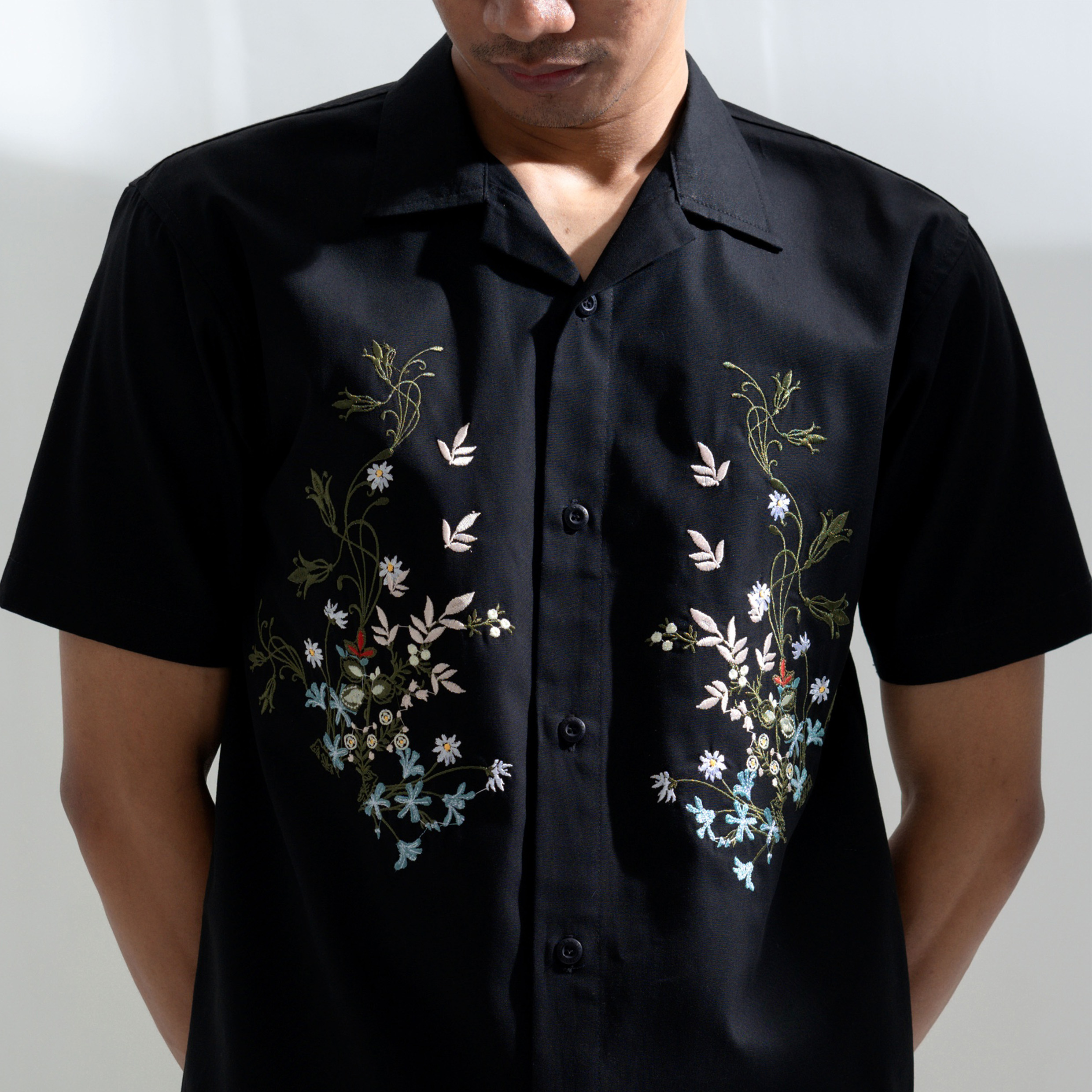 Desain floral Celosia dengan kombinasi warna lembut seperti hijau, biru, dan putih memberikan kesan segar dan dinamis di atas dasar warna hitam klasik. Potongan relaxed fit dan Cuban collar menjadikan kemeja ini mudah dipadukan dengan berbagai gaya, dari casual hingga smart look.