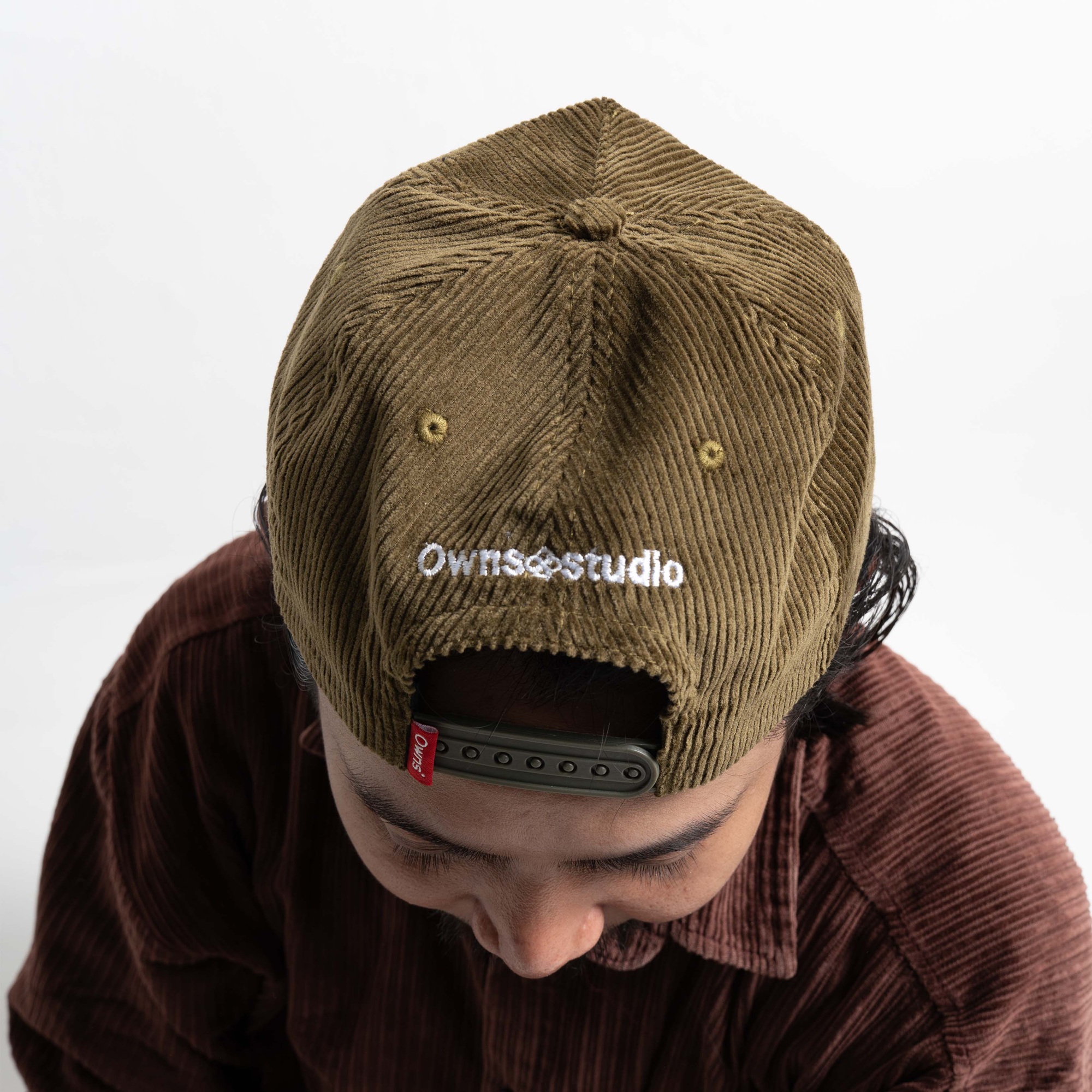 Bagian depan menampilkan bordir logo simbol Owns sebagai statement visual yang clean dan ikonik. Pada bagian belakang terdapat bordir tulisan “Owns Studio”, dilengkapi strap snapback adjustable dengan detail label merah khas Owns sebagai identitas brand. Eyelet ventilasi disematkan untuk menjaga sirkulasi udara tetap optimal saat digunakan.