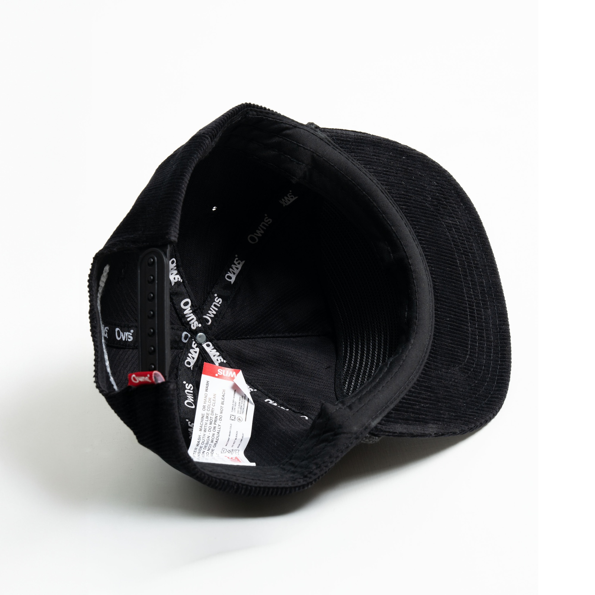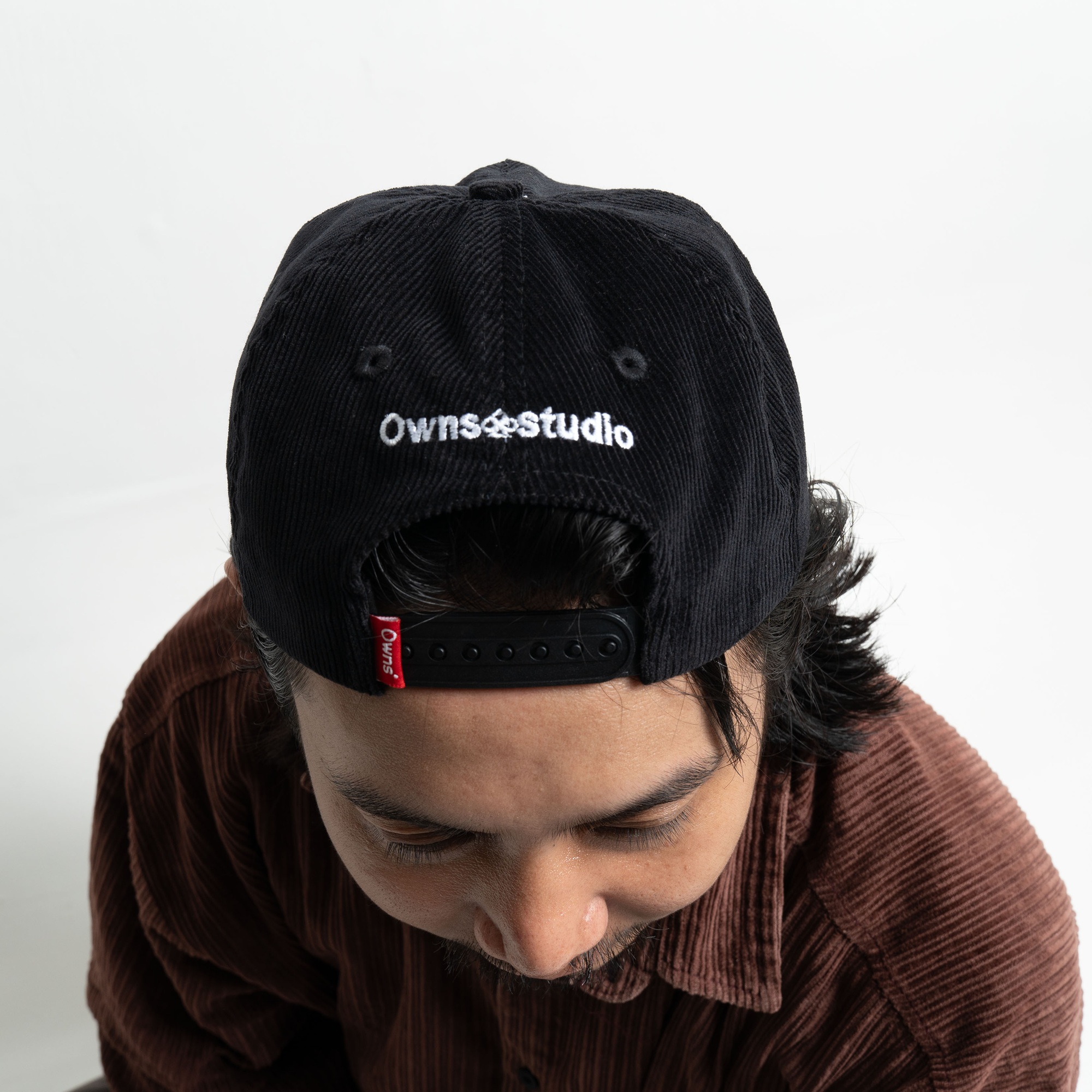 Bagian depan menampilkan bordir logo simbol Owns yang rapi dan presisi, memberikan identitas visual yang kuat namun tetap subtle. Di bagian belakang terdapat bordir tulisan “Owns Studio”, dilengkapi strap snapback adjustable dengan detail label merah khas Owns sebagai aksen branding. Eyelet ventilasi disematkan untuk menjaga sirkulasi udara tetap nyaman sepanjang pemakaian.