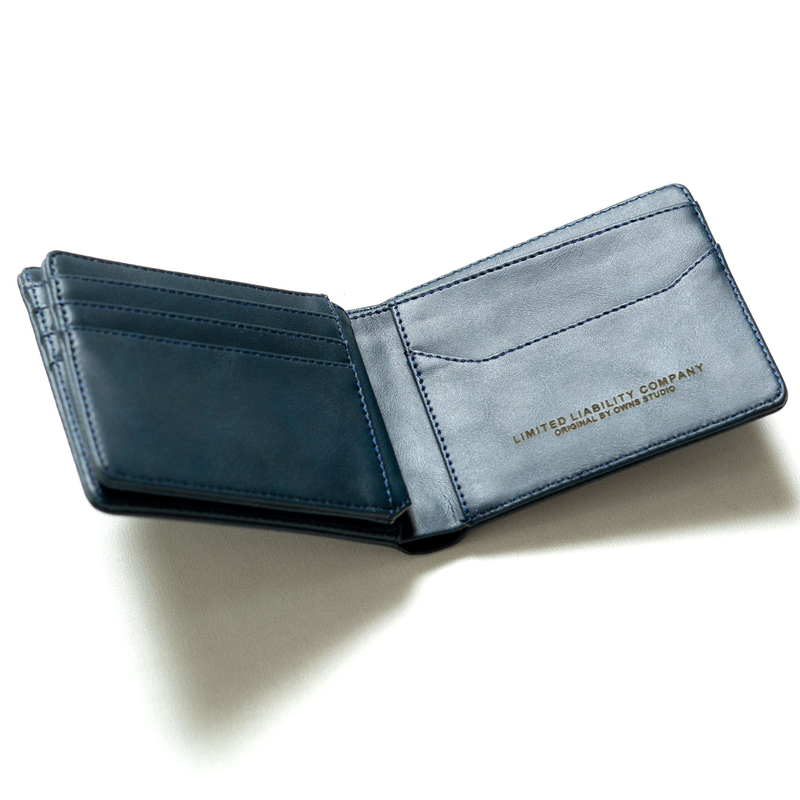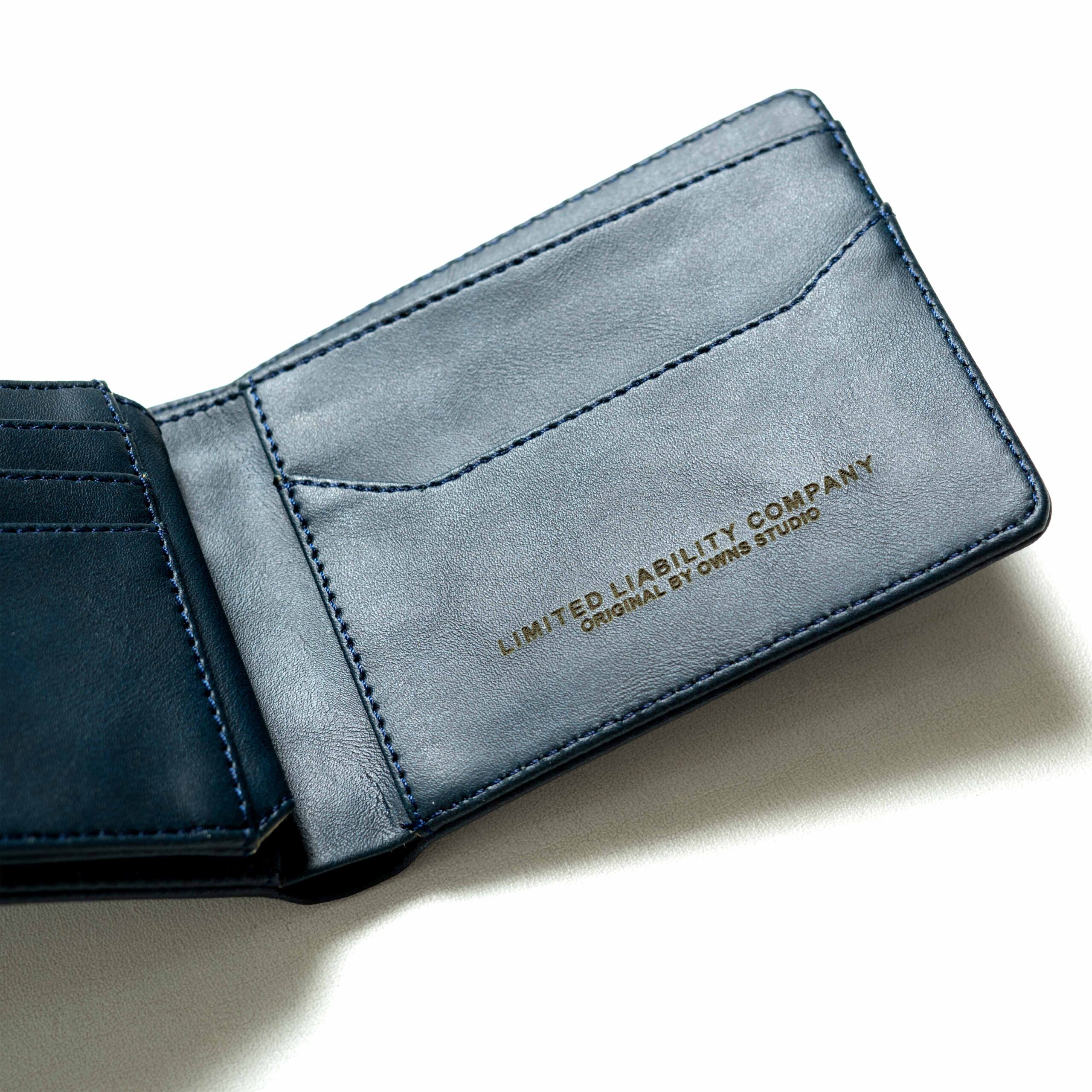 Desain: Warna Slate (Abu Kebiruan) modern, logo Owns pada bagian luar, dilengkapi slot kartu transparan (ID card), beberapa slot kartu, dan ruang uang kertas yang luas